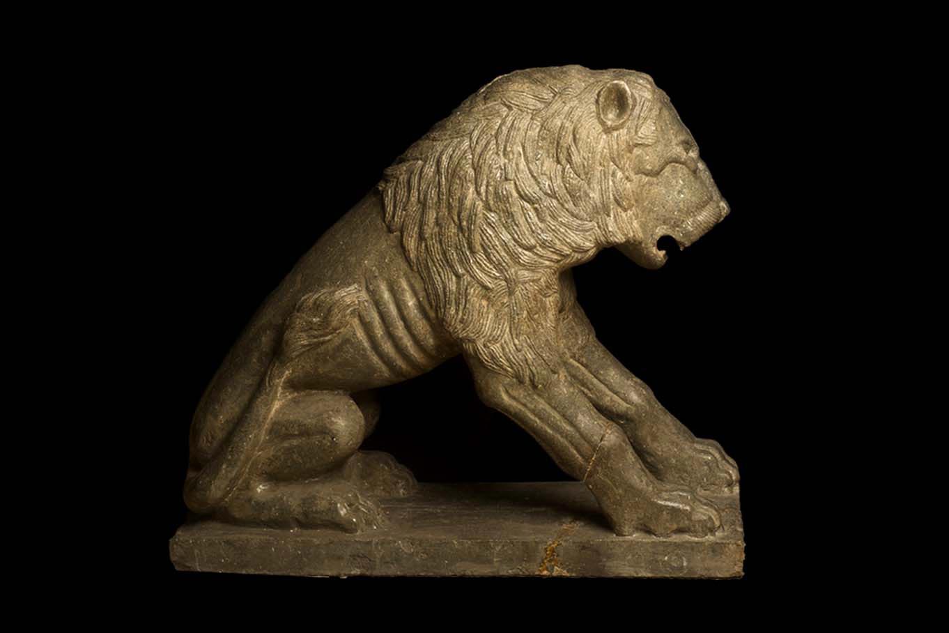 The figure of the lion has always been prominent in humanity's artistic imagination; from the prehistoric graffiti in the Chauvet cave to the famous Egyptian sphynxes, right up to the bronze lions in London's Trafalgar square, which date back to the 19th century. Particularly in Medieval times (12th - 14th century) lion figureheads were often placed on cathedral facades or guarding entrance gates. The lion after all stood for nobility, courage and strength, and many artists felt obliged to use this proud animal as a representation of power and heroism. In all likelihood this lion sculpture, given its size and its square base, was probably located in a pedestal in the entrance of a noble residence. The careful detail found in the sculpting of its mane is juxtaposed to a rather approximate depiction of the animal's anatomical elements. This sculptorial asymmetry was not uncommon in the 13th century, when style focused more on highlighting symbolic elements: and the mane has always been the feature of the lion that best represents its strength. The crouched position and the linear welts that run the length of the body as far as the face, lead us to believe that this lion may have been sculpted by middle eastern craftsmen.